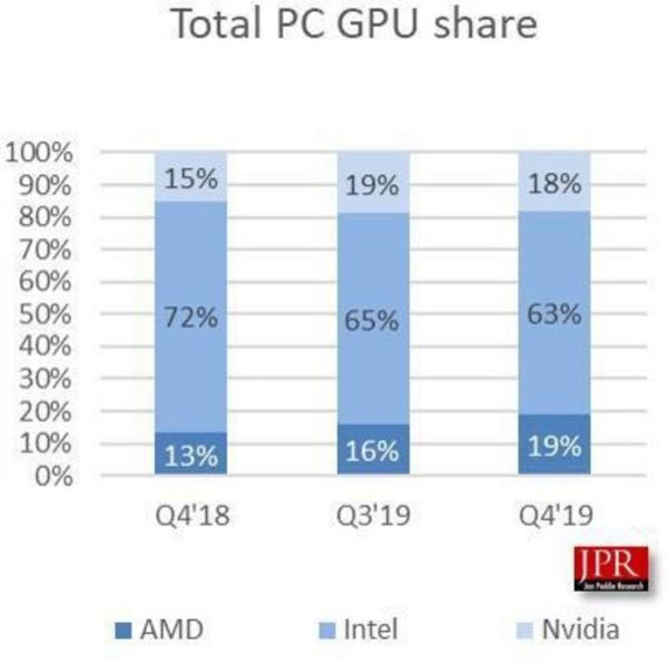 在半导体行业,巨头们投入到芯片研发上的成本都不低,这也成为他们提高芯片竞争力的关键所在。根据行业情报公司JPR近日公布了2019年Q4全球GPU出货量榜单,三巨头中,英特尔依然霸榜,不过AMD和英伟达所占的市场份额也在进一步提升,这对于英特尔来说并不是好消息。