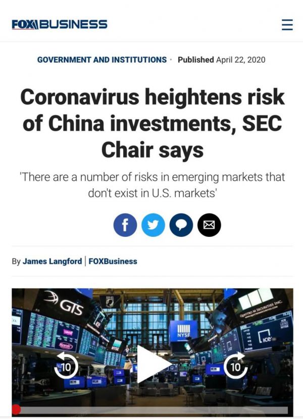 《美国SEC主席警告:不要将资金投入在美国上市的中国公司股票!》和讯网 2020年4月