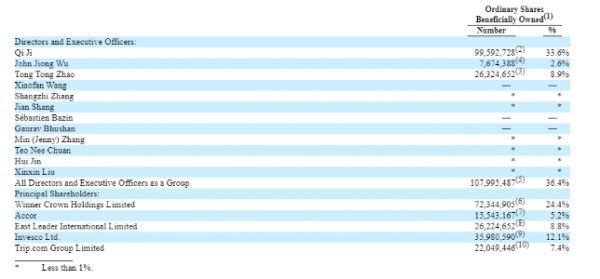 Winner Crown(季琦及其家人控制)实益拥有华住股权24.4%,East Leader(赵彤彤及其家人控制)实益拥有华住股权8.8%;