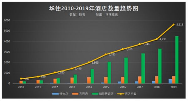 截至2019年12月31日,华住共有5,618家开业酒店,其中包括688家直营店、4,519家管理加盟店、411家特许店。