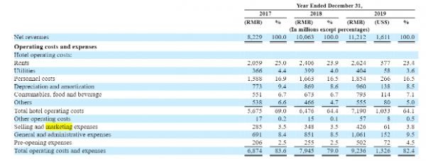 过去三年,华住的销售和营销费用逐年上涨,2017年、2018年、2019年分别为2.85亿元、3.48亿元、4.26亿元。销售和营销费用主要包括支付给旅游中介商的佣金、营销推广活动的费用、处理客人银行卡支付的银行服务费等。