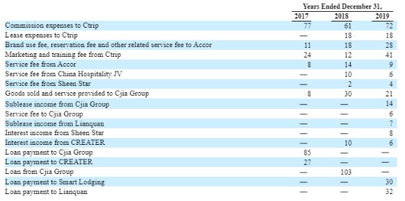 2017年、2018年和2019年,华住直营酒店向携程支付的预订服务佣金总额分别为7700万元、6100万元和7200万元;同时期,华住为携程提供了营销和培训服务,因此获得的服务费分别为2400万元、1200万元和4100万元。