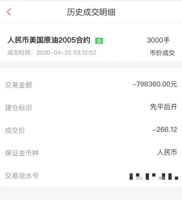 于是,我在手机上进行简单的操作之后,就买入了,买的时候20块钱一桶,后面又补了几次。最多的时候是4月12号,高峰期持有3000桶,但是后面跌得太凶了,我就开始减仓,到4月20日减到700桶,当时我的损失就已经很大了,原来160一桶的价格,跌到了80一桶,已经亏了10多万。