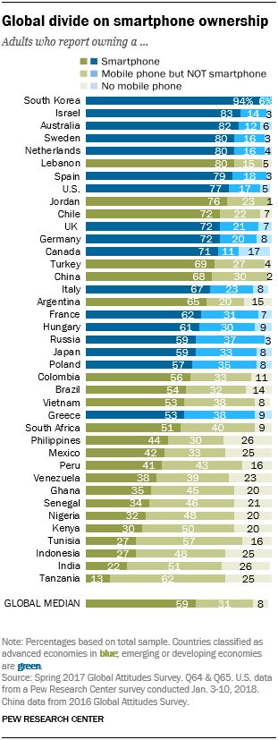 “螳螂财经”清楚,并不是每个人都能使用非现金支付。根据CNNIC发布的第44次《中国互联网络发展状况统计报告》,截至2019年6月,我国互联网普及率达到61.2%,其中,网民使用手机上网比率达到99.1%。假定所有能上网的手机均为智能手机,由此推断,我国智能手机持有比例约为60.6%。而根据美国皮尤公司(Pew Research Center)2018年的数据,中国智能手机持有率为68%。无论如何,仍有30%-40%的人群目前无法使用智能手机上网。