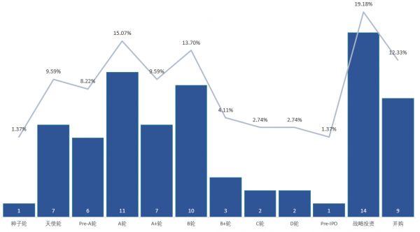 从融资轮次看,项目集中在早期项目和战略投资,其中战略投资达到14笔,而天使轮和A轮融资分别达到7笔和11笔,相较上周而言战略投资和早期项目的比重下调,中后期项目得到关注。