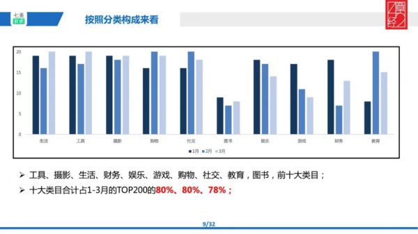 然后我们分别统计 1、2、3 月里 Top 200 中分类 App 的具体数量,并将数量结果放在一起进行对比就出现了以下三组情况: