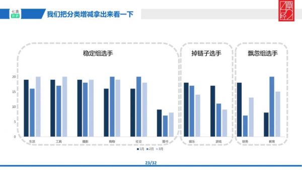 3、飘忽组:剩下的就是财务类和教育类,在不同月份的榜单上 App 数量有明显大幅度的增减,表现忽上忽下。教育就更突出了,在 2 月份增长大爆发,在 3 月份就掉了下来,但没有掉得特别多,所以教育这个类目中有些公司是拿到了这一波增长红利的。