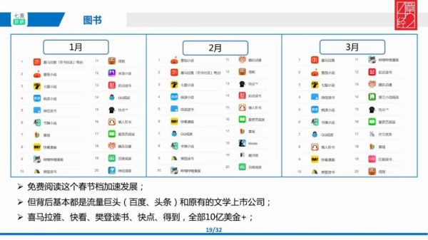 最后是图书,虽然叫图书,但榜单里很多都是免费阅读的 App。免费阅读在过去一年里是一个从兴起到爆发的过程,前 5、6 名都拿到了非常多的钱。但免费阅读的头部产品背后基本上都有一个流量巨头,无论是头条、百度,还是说原有的大的阅读类公司,比如阅文、掌阅。这其中有几家公司,比如喜马拉雅、快看、樊登读书、快点、得到基本都是 10 亿美金以上的体量。