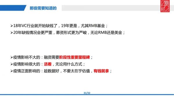 更可怕的是我们在短期之内看不到变好的迹象。对于初创公司而言,当务之急就是去看疫情对自己公司和业务影响大不大。影响不大,融资就需要阶段性的里程碑事件,创业者要能够证明公司有实力迈入一个新的发展阶段,才足以说服投资人投给你新的钱,不然大家一定是处于观望状态,因为当下观望是最安稳的策略。