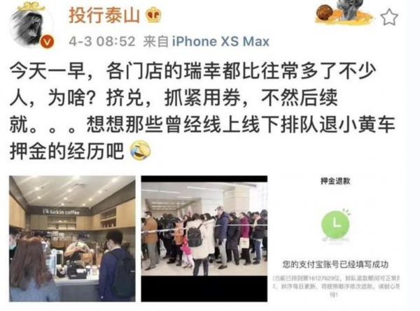 微博上,有多位用户称,瑞幸咖啡遭挤兑,用户用券。