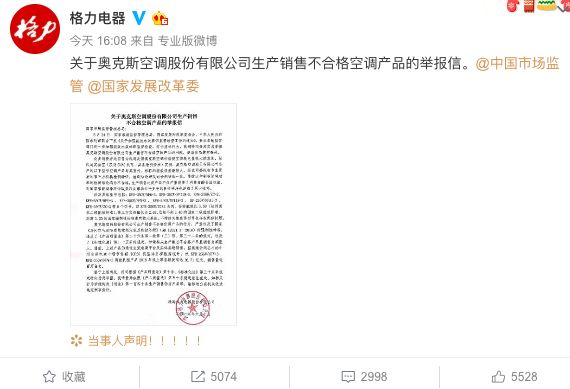 格力微博发举报信:举报奥克斯生产销售不合格空调