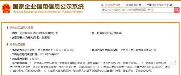 据国家企业信用信息公示系统显示,6月5日,北京搜狐互联网信息服务有限公司新增行政处罚信息,决定书文号为京工商海处字〔2019〕第518号,因发布“七旬老汉再婚丑闻咨询,震惊全国!”等四条违规广告,北京市工商行政管理局海淀分局合计处罚搜狐12万元。