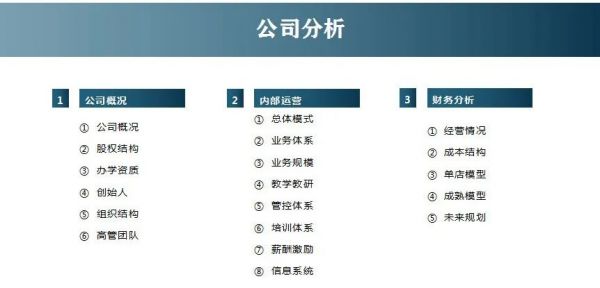 一般第一页会有一个投资亮点的抓取,在经过对于公司及行业的整体了解之后,会对行业赛道、公司在教学体系、品牌、团队、管理制度、财务状况、商业模式等有一个亮点提取,算是对这个企业的肯定。