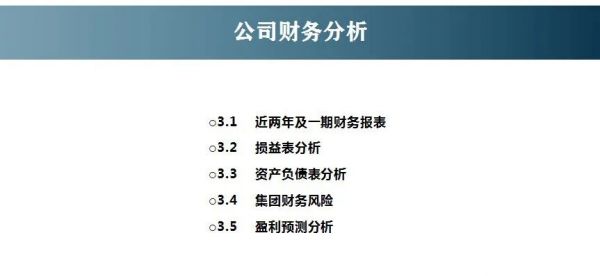 财务情况分析中,首先会从财务报表部分进行整体呈现,进而对资产负债表、利润表、现金流量表进行分析,从而发掘企业的真实财务数据以及财务亮点及风险,通过对财务及业务的理解进行盈利预测。如下图所示: