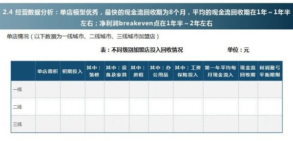 单店模型分析:根据将店按照一线、二线、三线的方式进行划分,通过分析投入以及回收情况,进行现金流回收期、利润盈亏平衡的测算。