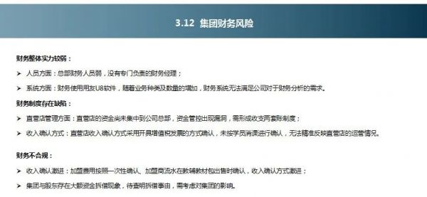 财务制度容易形成缺陷,包括货币管理制度和收入确认方式制度,后者往往是由于无法及时及精准计算销课或有意进行税收筹划的原因发生;收入确认激进以及集团与创始人资金往来不清晰:前者是管理层的要业绩的原因,导致与会计准则不一致的收入确认方式;后者是培训行业的普遍现象,更有甚者,企业一方面想融资,另一方面仍坚守着公私两套账的做账方式,不愿意在前期进行财务规范化,这样只会导致后期的企业管理问题越来越大。