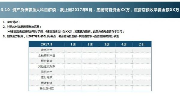 资产负债表重大科目分析:对于报表中重大科目进行解读,当然了,往往培训机构中,货币资金、往来款项和预收款项的关注度,永远都是最高的。在关注货币资金时,要注意公司货币资金的使用用途,很多机构将货币资金用于理财,实际上也是属于货币资金。但是在资产负债表和现金流量表中容易让报表使用者形成误解。