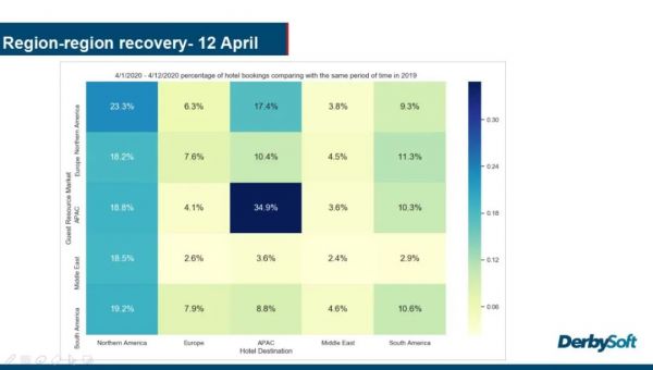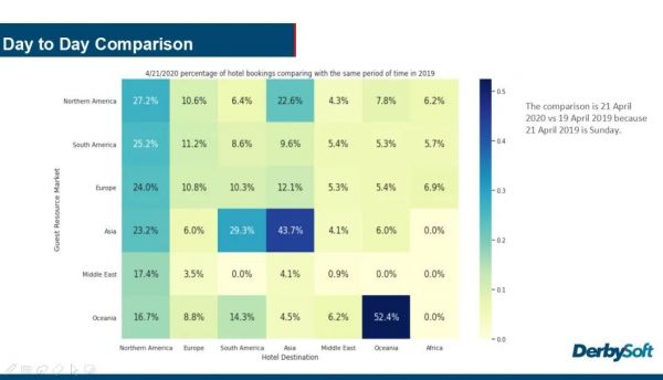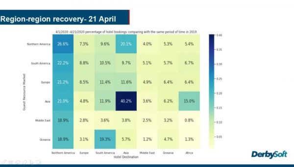 从4月1日-21日期间的数据来看,整体而言,北美地区的酒店预订情况恢复最好,来自亚洲、欧洲、南美、北美客源市场的预订量恢复到了去年同期20%以上的水平,而来自于中东和大洋洲客源市场的预订量也恢复到了18.9%。