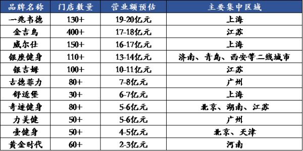 中国仅有少数几个头部健身品牌门店数量超过100家,且大多分布区域集中。