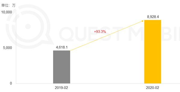 运动健身APP行业月活数据规模快速增涨,2020年2月同比增长达93.3%