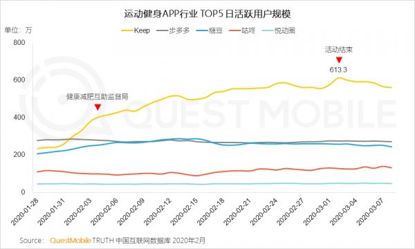 健身APP头部公司Keep在节后发起了健康减肥互助监督局的活动,得到用户的响应,活动期间日活跃用户规模上涨60%达到613万。