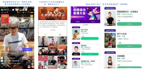 在线上已形成一套成熟运营体系的Keep还增加了直播课程,公开报道数据显示:截至2月上旬,Keep联合10余家品牌推出的线上直播累计参与人数突破5,600万。除此外,短视频更是所有健身从业者聚焦的流量战场。乐刻公布的最新数据显示:截至2月15日零点发起的“宅家运动会”在抖音、快手等平台的总播放量突破10亿;而超级猩猩在一直播平台上的“超猩家里蹲”账号高峰时期有几百万人在线观看。