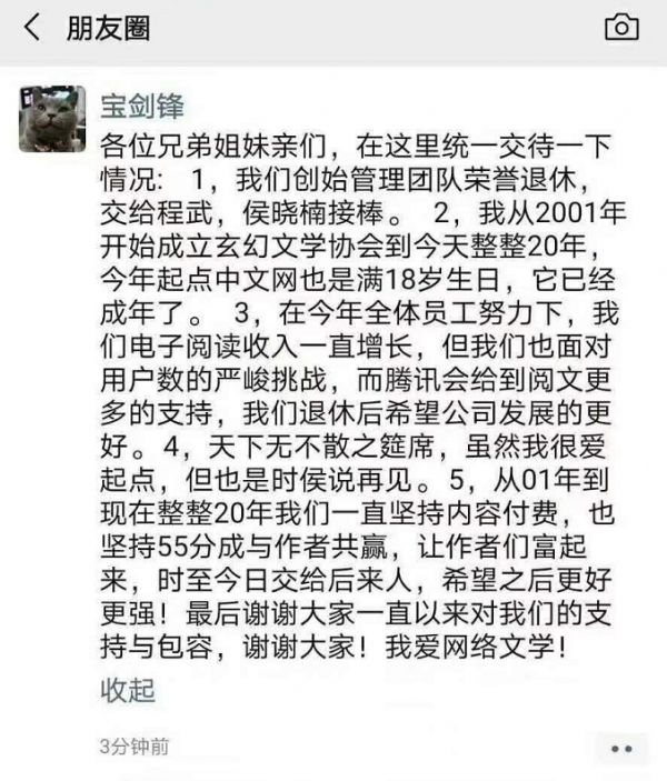 阅文集团高级副总裁林庭锋(宝剑锋)在朋友圈特意提到,“从01年到现在整整20年我们一直坚持内容付费,也坚持55分成与作者共赢,让作者们富起,时至今日交给后来人,希望之后更好更强!”