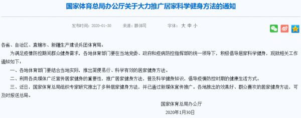 国家体育总局倡导通过居家健身满足疫情防控期群众健身需求