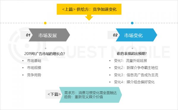 2019年的互联网广告市场正在发生一场变革,无论是从供给方还是从需求方,都在变化中迎合营销环境的变化。本篇报告将从供给方、需求方分别描述互联网广告市场变化。