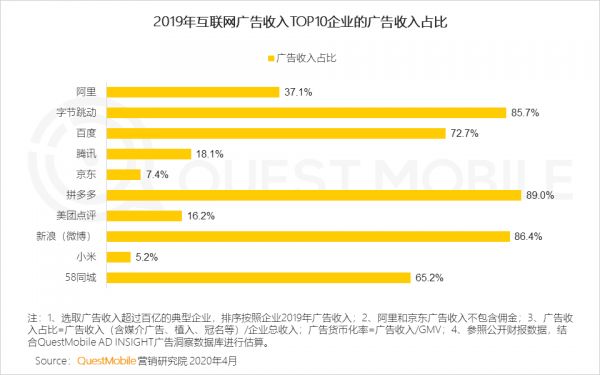 QuestMobile数据显示,互联网领域广告收入超百亿的企业中,以广告为主要变现方式,广告收入占比超过80%的分别是拼多多、新浪微博和字节跳动。小米、美团这2年发力广告业务,新进百亿梯队。这也进一步佐证了中国互联网诞生之日起,用户和流量的本质含义就是广告收入。