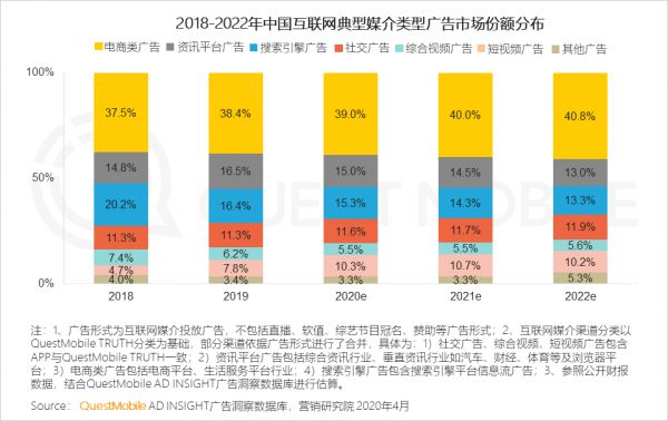 另一方面,广告类型从展示,向“展示+效果”迁移。2019年,电商广告、信息流(包括资讯和短视频)广告基本上都维持在40%左右的增长,预计到2021年,电商广告、信息流(包括资讯平台和短视频平台)广告占比将分别达到40.0%、25.2%。