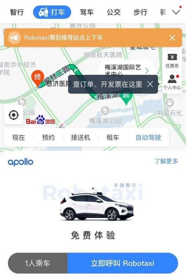 到了今年4月20号,百度正式在长沙开启了Apollo Robotaxi自动驾驶出租车服务,普通市民也能免费试乘。值得注意的一点是,百度的自动驾驶出租车服务也是在百度地图打车页面上实现。