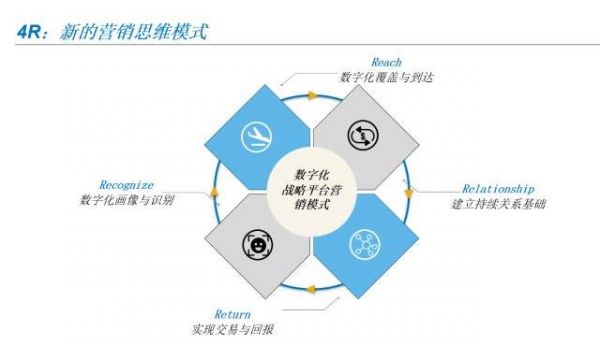 4R的营销模式分为四个模块:一、客户画像与识别(Recognize);二、数字化覆盖与到达(Reach);三、建立持续关系基础(Relationship);四、实现交易与回报(Return),以上四个模块,就是数字营销的“4R”。它能够帮助大中型企业构建出完整的数字化转型的闭环系统。比如我们与阿里有着非常深入的合作,阿里所提出的数字营销的方法论,比如品销合一,品牌为大,一页霸屏,还包括数据银行等等,跟“4R”是高度吻合的。