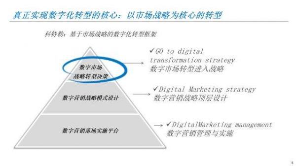 数字化转型有几种不同的切入维度,比如从组织的角度,从企业文化的角度等等。但是我认为,真正能够落地的是市场战略,是Marketing,是营销。为什么呢?因为营销或市场战略直接决定了企业价值创造的方式,直接决定了企业与客户彼此接触的界面。而其他的转型模式,都是用来支持客户体验和客户价值的。这就是为什么营销学之父菲利普·科特勒说,他眼中的营销是一种市场导向型战略,它应该变成公司的第一战略。因此,我们说,市场营销的转型,实际上就是数字化转型的入口。