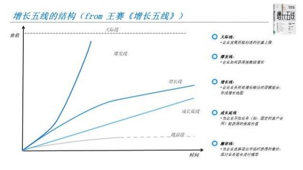 所谓“五线”包括撤退线(收缩线)、成长底线(业务增长的基础)、增长线(从现有资源和能力出发所能找到业务增长点)、爆发线(指数级爆发性增长的路径)和天际线(企业增长的天花板)。
