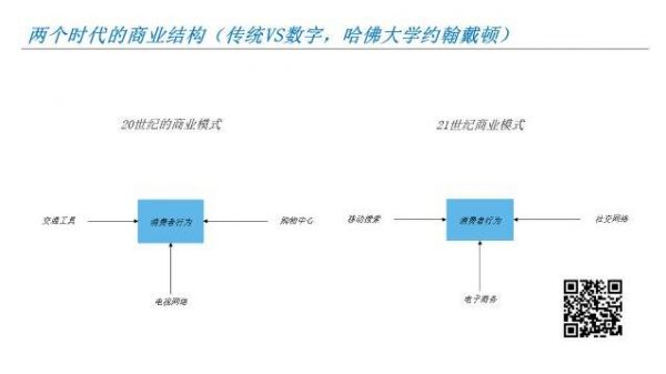那么,数字时代整个结构当中的逻辑是什么呢?在上图的右侧,显示了约翰·戴顿教授提出了“新三种力量”:是移动搜索、社交网络和电子商务。
