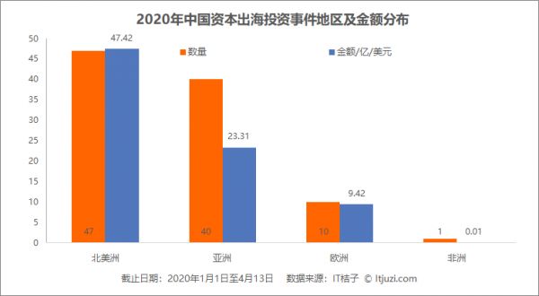 从数据结果来看,针对非洲和南美地区的投资,在 2020 年 Q1 陷入「冰点」,鲜少发生有公开数据披露的投资事件;一季度中国资本出海投资案例中,接近 80% 的投资发生在北美和亚洲地区。