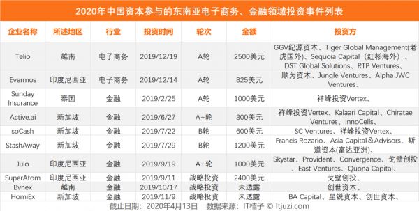 在汽车交通、企业服务以及电子商务领域,中国资本则更偏重于东南亚地区,IT 桔子数据显示,2019 年中国资本参与了 12 起东南亚地区电子商务和金融领域的投资事件。