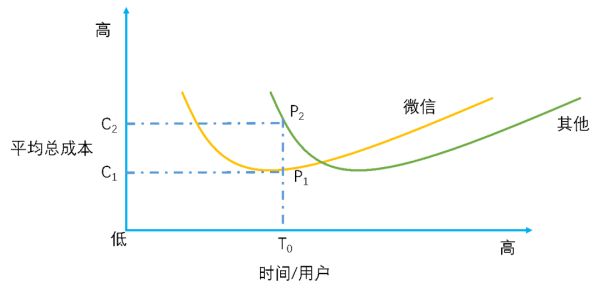 我们以微信为例,看多闪、子弹短信等软件,为何无法取代微信。如图 4所示,横轴代表随着时间的推移,社交软件的用户数量,纵轴表示产品的成本。可以看到,微信经历了约9年的发展和推广,积累了约10亿用户,此时无论是谁进入该市场,都面临高昂的成本壁垒,也就是下图中T0时刻对应的点P1和P2,显然P1对应的平均总成本C1,小于P2对应的平均总成本C2。