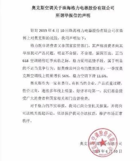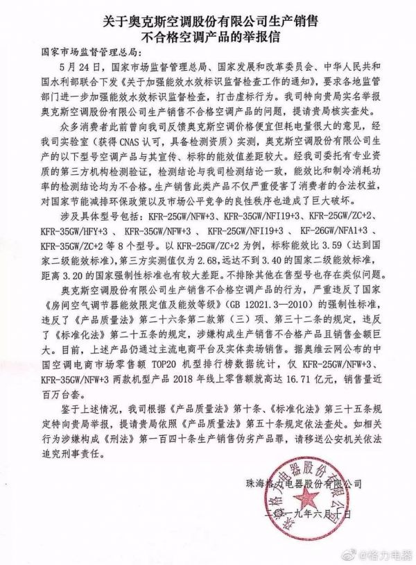 昨日下午,格力电器发出了对奥克斯空调的公开举报信:空调与宣传、标称的能效值差距较大,能效比和制冷消耗功率均不合格,奥克斯旋即回应说:诋毁,报案。