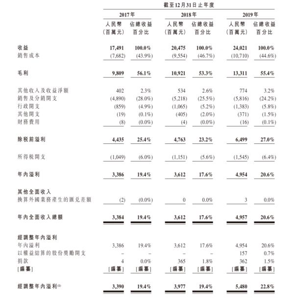 2017年至2019年,农夫山泉的收入分别为174.91亿元、204.75亿元和240.21亿元(人民币,下同),年复合增长率为17.2%,高于同期中国软饮料行业5.8%以及全球软饮料行业3.1%的增速;净利润则分别为33.86亿元、36.12亿元和49.54亿元,净利润率分别为19.4%、17.6%及20.6%,同样远高于国内外软饮料行业不足10%的平均盈利水平。