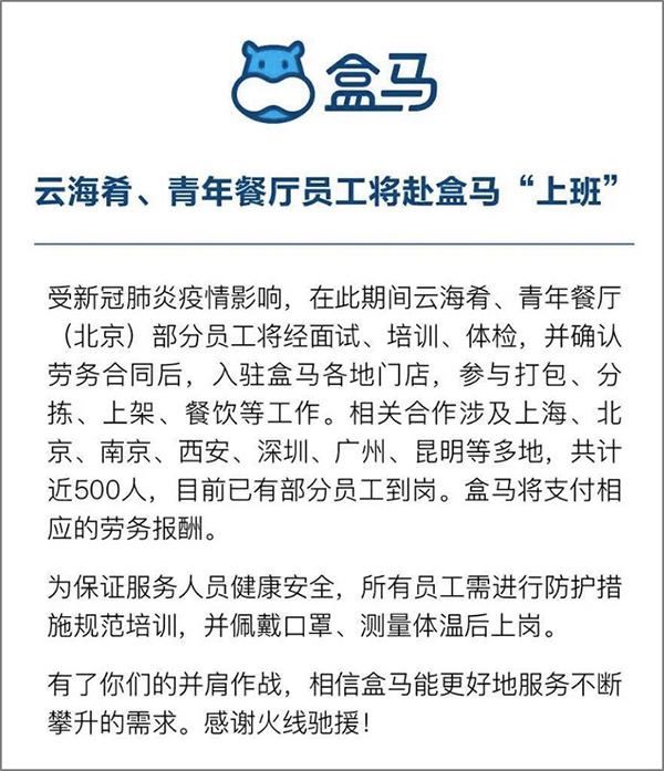 还有之前刷爆全网的盒马“员工共享”计划,就是出自猎聘HRO·勋厚人力。疫情期间,云海肴、青年餐厅将自有员工的“使用权”租赁给盒马鲜生,助力盒马鲜生实现了订单增长期间人力资源的优化配置,解决了其人员紧缺的现状,同样也缓解了战“疫”时期餐饮行业的企业用人成本高的难题,更为餐饮业员工的收入提供了保障。