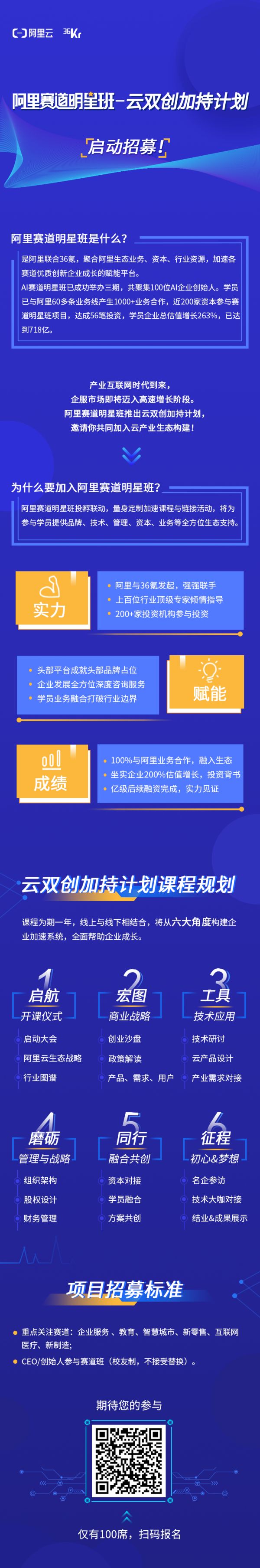 寻找最具创新力、成长力和价值的项目,通过阿里生态赋能、行业专家指导、投资机构对接以及36氪品牌曝光四大核心权益,帮助他们实现资本和资源的高效链接,以进一步促进云产业生态建立及创新项目发展。