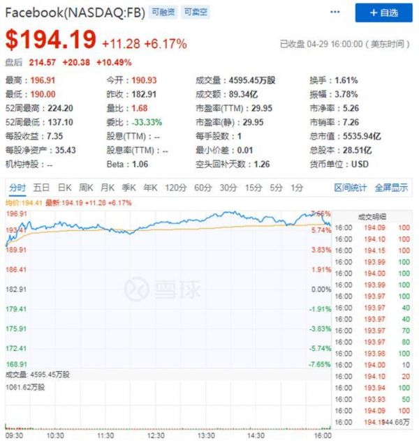 在财报发布后,截止文章发稿,Facebook盘后股价为214.57美元,盘后涨幅为10.49%,市值为5535.94亿美元。