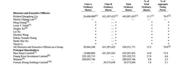 京东2019年财报显示,目前,刘强东个人持股15.1%,投票权达78.5%。腾讯为京东最大外部股东与第一大股东,持股比例达17.9%,投票权占4.6%;刘强东的家族信托MaxSmart Limited持股14.8%;沃尔玛持股9.8%,有2.5%的表决权。