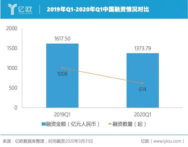 亿欧数据显示,2020年第一季度融资数量从去年1008起下降至614起,融资总额也从去年1617.50亿元人民币下滑至1373.79亿元人民币。
