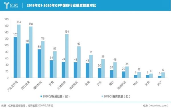 亿欧:2019年Q1-2020年Q1中国各行业融资数量对比