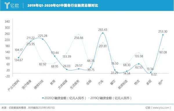 亿欧:2019年Q1-2020年Q1中国各行业融资总额对比