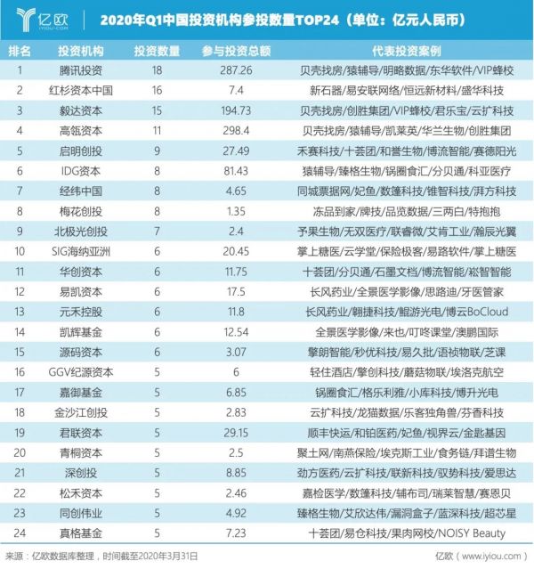 亿欧:2020年Q1中国投资机构参投数量TOP24(单位:亿元人民币)