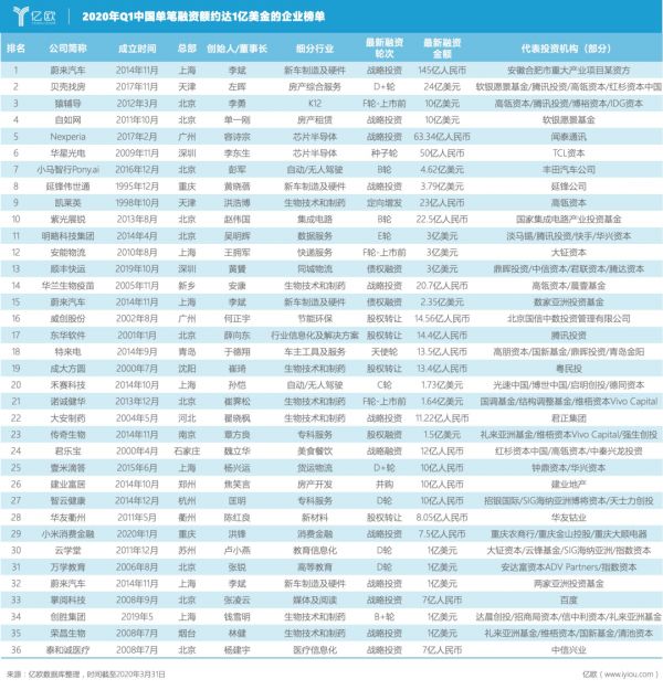 亿欧:2020年Q1中国单笔融资额约达1亿美金的企业榜单
